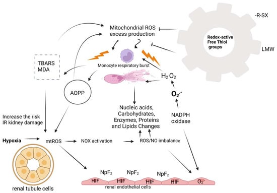 The main factor for maintaining physiological tone in the blood vessels of the kidneys, endogenous O2, is induced by Nicotinamide adenine dinucleotide phosphate (NADPH) oxidase (NOX) in the blood vessels [,]. NADPH oxidase and xanthine oxidase are enzymes that are involved in the occurrence of oxidative stress. In polymorphonuclear leukocytes, under the action of NADPH oxidase, free radicals are created during the process of converting oxygen molecules into superoxide anions []. Further, the superoxide anion is converted into hydrogen peroxide H2O2. Both products of NADPH oxidase activity, superoxide anion and hydrogen peroxide, are precursors for producing more potent oxidants by creating conditions for other reactions []. Nitrosative stress occurs when the superoxide anion reacts with nitrogen oxide; on this occasion, the toxic product peroxynitrite is created [].