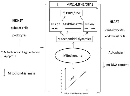 Initiating regenerative processes to recover tubule epithelial cells after acute kidney damage is also important. That is why some knowledge about the impact of mitochondrial function and stress on the function of heart and kidney cells was analyzed. The concept of mitohormesis indicates that the level of stress and the duration of the stress are important for triggering the hormetic response. Disturbance of function, perturbations of mitochondria, and resistance of mitochondria to stress have an impact on kidney and heart function.