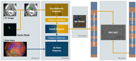 Label-free fluorescence lifetime imaging (FLIm) has evolved as an intra-operative tool for tumor margin detection in HNC surgery [23]. FLIm can identify tissue composition by measuring fluorescent signatures from endogenous fluorophores. Our previous studies show that FLIm achieves high accuracy (AUC of 0.94) in differentiating healthy and cancer tissues [24]. These findings suggest that fluorescence decay characteristics may correlate with biological behavior and have the potential for identifying lymph node metastases. We hypothesized that a combination of radiomics and FLIm features of primary tumors could improve the accuracy of LNM prediction. This study aims to investigate the potential of integrating fluorescence signatures from intra-operative FLIm together with pre-operative CT images to improve LNM prediction. The results of this study could potentially be used for real-time guidance of HNC surgery based on LNM and tumor aggressiveness predictions. To our knowledge, this is the first study combining pre-operative CT imaging and intra-operative FLIm for surgical guidance. Ultimately, this approach has the potential to significantly impact the management and overall prognosis of HNC patients.