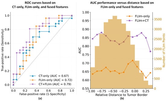 AUC comparisons using CT features only, FLIm features only and a combination of FLIm and CT features. (a) Comparison of ROC curves using fused features (purple curve), CT features alone (blue curve), and FLIm features alone (orange curve); (b) AUC performance versus relative distance from the location of the FLIm measurement to the tumor border based solely on fused features (purple curve) and FLIm features alone (orange curve), with yellow histograms illustrating the distribution in the relative distance of FLIm measurements. The relative distance is the ratio of the distance from the point to the tumor border (in centimeters) over the maximum distance within the tumor.