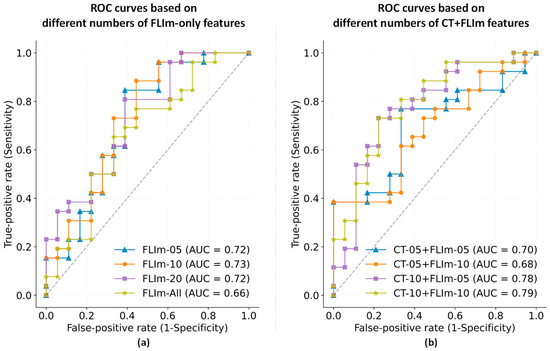 Comparative ROC curves for varying numbers of features. (a) FLIm-only classifiers: “FLIm-n” indicates that a total number of n FLIm features were selected. (b) CT + FLIm classifiers: “CT-n + FLIm-m” indicates that n CT features and m FLIm features were selected.