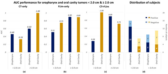 AUC performance and subject distribution for small (<2.0 cm) and large (≥2.0 cm) tumor dimensions spanning two tumor anatomical sites (oropharynx and oral cavity). (a) AUC for CT-only classification; (b) AUC for FLIm-only classification; (c) AUC for combined CT + FLIm classification; and (d) the distribution of subjects by LNM status across varying tumor dimensions and sites. The X-axis divides tumors based on anatomical location (oropharynx vs. oral cavity) and size (<2.0 cm vs. ≥2.0 cm).