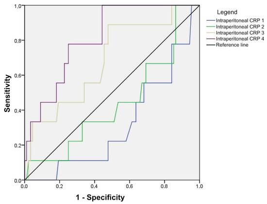 Diagnostic accuracy of intraperitoneal CRP in the detection of anastomotic leak, shown through ROC curves.