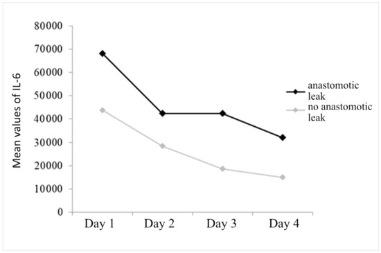 In our study, the values of IL-6 from the intraperitoneal fluid show an increase in the first postoperative day in both groups of patients, with the values being higher in patients with anastomotic leak. In both groups, the decrease in values is monitored until the 4th postoperative day. In the prediction of anastomotic leak, the measurement of the level of IL-6 on the first postoperative day has the greatest value. A patient with anastomotic leak will be detected with a 70.0% probability based on the IL-6 value on the first day, at a cut-off value of 42,150. In addition, in this study, six patients who had IL-6 values greater than 100,000 on the first postoperative day developed after 2–6 days clear clinical signs of anastomotic leak.