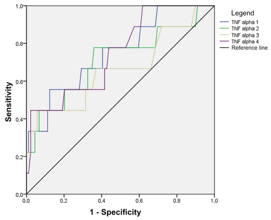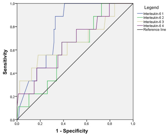 Statistically significant values are marked, where it is evident that the TNF-alpha value is good for detecting anastomotic leak on the first two days as well as on the fourth day of measurement (all three AUC > 0.700), with the accuracy in predicting anastomotic leak in the first two days being 70% at values higher than 78.00 on the first and 58.50 on the second day. On the fourth day, the sensitivity is slightly lower and is 56% for patients with values greater than 48.50 (Figure 8, Table 5).