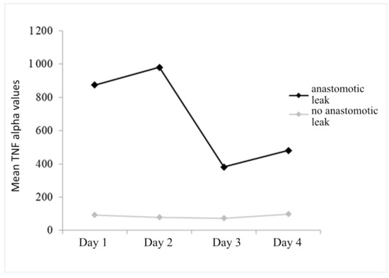 Measurement of TNF-alpha values in patients with anastomotic leak showed an increase in the first two postoperative days, followed by a decrease in TNF-alpha values in perioneal fluid. In patients without leak, TNF-alpha values were very similar on all four days of measurement. For the prediction of anastomotic leak, accuracy of TNF-alpha in the first two postoperative days is 70% at values higher than 78.00 on the first and 58.50 on the second postoperative day.