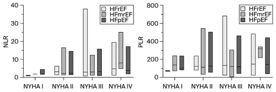 However, both the NLR and PLR presented a low, positive correlation with the NYHA functional class (r = 0.28, p < 0.001 for NLR; r = 0.15, p = 0.002 for PLR).