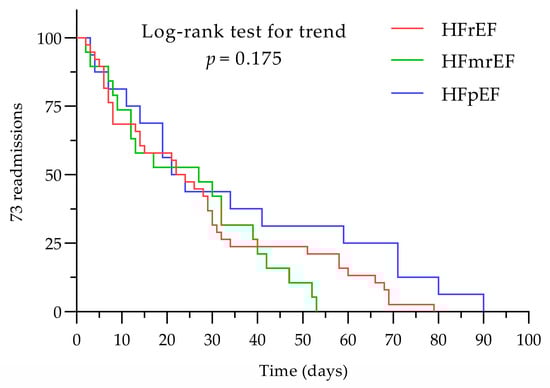 A log-rank test was calculated to test a possible difference regarding time event occurrence between HF phenotypes. For the present data, the log-rank test showed no difference between the groups regarding time distribution until the readmissions occurred (p = 0.175); results are presented in Figure 3.