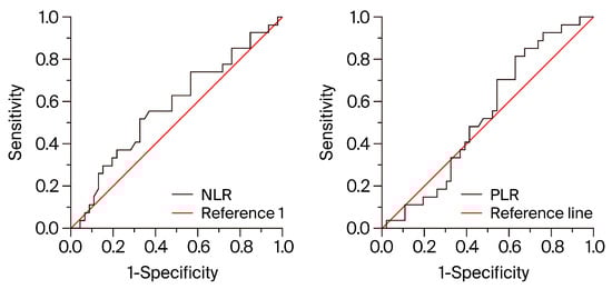 Receiver operating characteristic (ROC) curves were constructed to assess the ability of the NLR and PLR to predict early hospitalization. The areas under the ROC curve for NLR and PLR were not significant: 0.578 (p = 0.278) and 0.534 (p = 0.218), respectively. The ROC curves are illustrated in Figure 4.