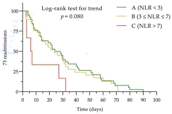 In terms of readmission days curves, NLR subgroups presented significant distribution data (log-rank Mantel–Cox p = 0.046); however the trend did not have a significant impact according to log-rank test for trend (p = 0.080; see Figure 5).