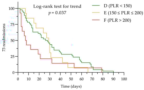 Applying the log-rank Mantel–Cox test between subgroups D, E, and F, the data were not significantly distributed (p = 0.103), but higher PLR values were associated with earlier hospitalization events using the log-rank test for trend (p = −0.037; see Figure 6).