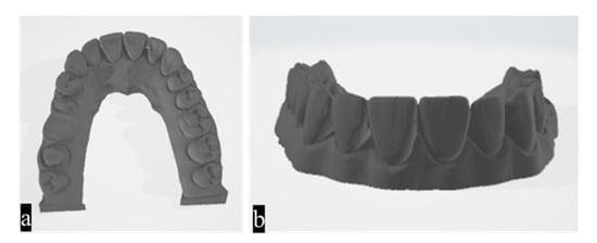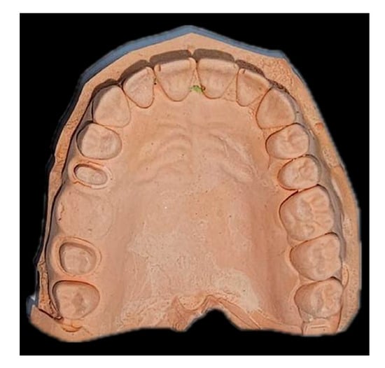 Immediately after the impressions had set, type 4 plaster was poured into them to create plaster models. We mixed 100 g of plaster powder with 20–25 mL of water, with a setting time of 40 min. The plaster models obtained were scanned using the reference scanner, and an STL file was generated for each model. A total of 10 STL files were created. An example is shown in Figure 2.