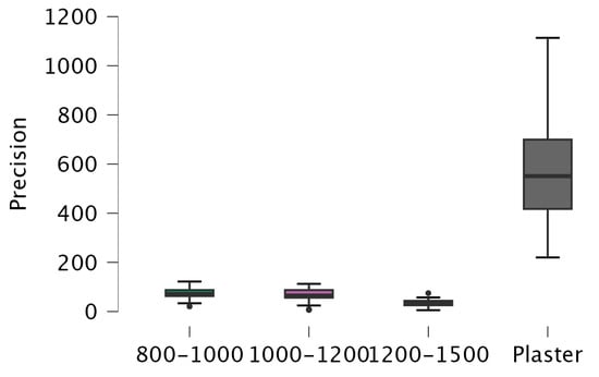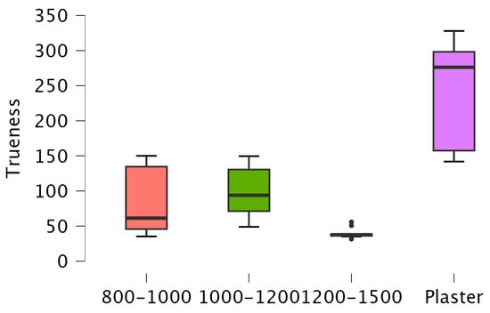 There is a significant difference between Digital 1200–1500 and Plaster (p < 0.001) and between Digital 800–1000 and Plaster (p = 0.007). However, there is no significant difference between Digital 1200–1500 and Digital 800–1000 (p = 0.335), Digital 1200–1500 and Digital 1000–1200 (p = 0.05), Digital 800–1000 and Digital 1000–1200 (p = 1), and Digital 1000–1200 and Plaster (p = 0.069) (Figure 3).