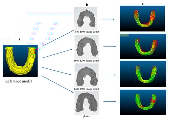 Taking more images during intraoral scanning can improve the quality and accuracy of the 3D model by providing finer details and better coverage of teeth and gums [8,9,10]. However, when the number of images exceeds 1600, the increased data may cause the software to make more errors [11].