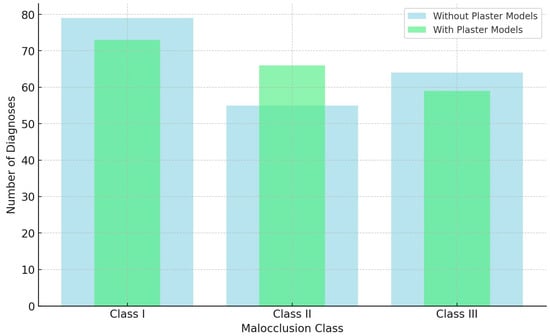 Without the use of physical plaster models, the malocclusion diagnoses were distributed as follows: Class I malocclusion 79 times (39.3%), Class II 55 times (27.8%), and Class III 64 times (32.3%). When plaster models were incorporated, the distribution changed slightly: Class I was diagnosed 73 times (36.9%), Class II 66 times (33.3%), and Class III 59 times (29.8%). There were strong intra-observer agreements between diagnoses with both digital records and physical models (ICC = 0.685; p < 0.0001), indicating consistent diagnostic outcomes. This suggests that while plaster models may offer additional insights, they did not significantly alter malocclusion classification (Table 2; Figure 2).