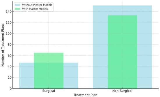 Regarding the need for surgical intervention in treatment planning for the different orthodontic malocclusion cases, in the treatment plans for the first evaluation setting with digital records per se, the majority of treatment plans formulated by orthodontists (151 treatment plans) (76.3%) were reported by evaluating orthodontists to be non-surgical, whereas surgical treatment plans were decided for 47 of the treatment plans (23.7%). For the second evaluation setting, with the addition of physical diagnostic plaster models, a statistically significant shift was reported in orthodontists’ treatment plans recommending surgical intervention for 65 treatment plans (32.8%) and non-surgical treatment plans 133 times (67.2%). This difference was statistically significant (p = 0.026), with a higher proportion of orthodontists advocating for surgery in the presence of physical plaster models (32.8%) compared to (23.7%) using digital records per se. This implied that plaster models did significantly influence the orthodontists’ “Treatment Plan Two” decision of surgical intervention vs. non-surgical intervention treatment plans (Table 2; Figure 4).