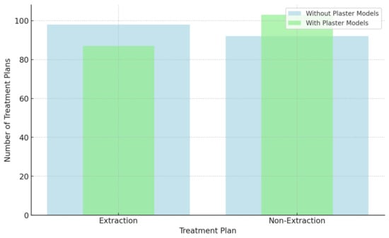 Concerning extraction vs. non-extraction treatment options for treating orthodontic malocclusion cases, for the first evaluation setting with digital records per se, extraction was chosen as a treatment option 98 times (51.6%), and non-extraction was chosen as a treatment option 92 times (48.4%), whereas for the second evaluation setting, with the addition of physical diagnostic plaster models, the distribution changed to extraction for 87 formulated treatment plans (45.8%), and non-extraction treatment plans were reported 103 times (54.2%). The slight decrease in preference for extractions (from 51.6% to 45.8%) as a result of adding the physical plaster diagnostic model to the digital records was not statistically significant (p = 0.266). This indicates that plaster models did not significantly influence the orthodontists’ “Treatment Plan Three” decision of interventional extraction vs. teeth preservation non-extraction treatment plans (Table 2; Figure 5).