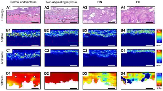 Comparison of the representative cases of normal endometrium (by example of secretory endometrium) (A1–D1), non-atypical endometrial hyperplasia (A2–D2), EIN (A3–D3) and EC (by example of low-grade EC) (A4–D4), where the following are presented: histological images (A1–A4), attenuation coefficient maps for co-polarization OCT images (B1–B4), attenuation coefficient maps for cross-polarization OCT images (C1–C4), C-OCE images (D1–D4); dotted lines and white arrows indicate border between endometrium and myometrium; bar size in all images is 0.5 mm.