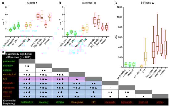 Boxplots for established Att(co) (A), Att(cross) (B), stiffness (C) values counted for each endometrial tissue types: normal endometrium, including proliferative, secretory and atrophy, indicated by green boxplots; endometrial hyperplasia, including non-atypical hyperplasia and EIN, indicated by orange boxplots; and different subtypes EC, including low-grade, high-grade, clear cell and serous, indicated by red boxplots. Centerline in the boxes—median; box limits—25th and 75th percentiles; whiskers—5th and 95th percentiles. Panel (D) shows the matrix of pairwise differential comparisons between different MM OCT parameters (●—Att(co) values, ■—Att(cross) values, ▲—stiffness values) for various endometrial tissue (Mann–Whitney U-test with a Bonferroni correction for multiple comparisons). The purple partitions indicate the possibility of differentiating EIN from benign endometrial tissues (non-atypical endometrial hyperplasia and normal endometrium). The blue partitions indicate the possibility of differentiating EC from endometrial hyperplasia and normal endometrium.