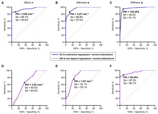 ROC curves showing the results for differentiation: EC from endometrial hyperplasia and normal endometrium (A–C), EIN from non-atypical hyperplasia and normal endometrium (D–F) based on the analysis of Att(co) (A,D), Att(cross) (B,E) and stiffness (C,F) values. Symbols (●—Att(co), ■—Att(cross), ▲—stiffness) on the curves represent choices of the threshold value (Pth) using a trade–off between the percentages of the false negative and false positive outcomes; designations: Se—sensitivity, Sp—specificity.