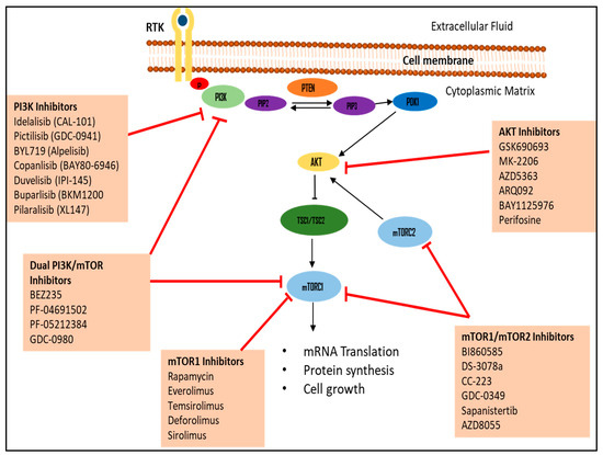 PI3K contains several isoforms such as PI3Kα, β, δ, and γ which contribute to different cancer subtypes at various rates [110,111]. Therefore, various inhibitors targeting these isoforms have been synthesized and clinically studied in several clinical trials [112]. Pan-Class I-PI3K inhibitors are a class of targeted agents that were synthesized to inhibit all four PI3K isoforms [113]. This class of medical drugs, such as buparlisib and pictilisib, have shown modest clinical efficacy in clinical trials due to their cellular toxicities which limit the clinical utility of these agents [114,115,116]. Therefore, it is essential to investigate more tolerable treatment options, such as isoform-selective PI3K inhibitors that particularly target specific PI3K isoforms. For instance, BYL719 (Alpelisib) is an oral selective inhibitor that is designed to inhibit PI3Kα (PIK3CA) [116,117]. Preclinical studies revealed that Alpelisib inhibits PI3K signaling, prevents AKT phosphorylation in cell lines with PIK3CA mutations, and blocks tumor growth in xenograft models [118]. The first-in-human phase Ia revealed a tolerable safety profile and promising preliminary activity [119]. This supports the use of Alpelisib as a selective PI3Kα inhibitor in combination with other agents for the treatment of tumors harboring PIK3CA mutations [119]. On the other hand, idelalisib (CAL-101) is an oral-specific inhibitor of the PI3Kδ isoform which has been approved by the Food and Drug Administration (FDA) [120,121]. It has shown an independent inhibition for PI3Kδ isoform activity without affecting PI3K signaling essential for the normal function of healthy cells [122,123]. Idelalisib is the first FDA-approved inhibitor used in combination with rituximab in patients with relapsed or refractory chronic lymphocytic leukemia (CLL) [120,121]. Additionally, it is recommended as a monotherapy for relapsed small lymphocytic lymphoma (SLL) and follicular lymphoma patients who have previously received at least two systemic therapies [124]. Furthermore, Copanlisib is a PI3K α and γ isoform inhibitor that has been approved by the FDA for the treatment of adult patients with relapsed follicular lymphoma (LF) who were previously treated with two or more systemic therapies [125]. This approval provides an additional option to treat patients with this slow-growing type of non-Hodgkin lymphoma by blocking enzymes that promote cell growth [125]. Moreover, Duvelisib is a PI3K δ and γ isoform inhibitor that has also been approved for the treatment of adult patients with CLL and SLL, typically after two or more prior systemic therapies [126]. Despite the clinical development of many PI3K inhibitors, most of these inhibitors were not successfully implemented due to poor clinical response as a result of sub-optimal levels of the drugs when used as monotherapies [111]. Additionally, resistance to these inhibitors can be initiated from parallel signal activation or PI3K pathway reactivation [117]. Inhibition of AKT leads to feedback-mediated regulation of RTK, while the inhibition of mTOR accelerates AKT activity by removing the negative feedback on IRS1 leading to the release of PI3K inhibition through GRB10 [92]. Furthermore, PTEN negatively regulates PI3K signaling, and its loss of expression can lead to resistance to PI3K inhibitors [127]. However, dual inhibitors targeting both PI3K and mTOR can be beneficial to overcome feedback loops and PI3K inhibitor resistance and block PI3K-independent mTOR activation to maximize the efficacy of these inhibitors by suppressing parallel signaling pathways [111,112]. Several PI3K selective and dual PI3K/mTOR inhibitors are being clinically evaluated. BEZ235 (Dactolisib) is a dual inhibitor targeting PI3K and mTOR which is currently undergoing clinical trials [124]. The BEZ235 inhibitor selectively inhibits class I PI3K, mTOR1, and mTOR2 by binding to the ATP-binding kinases and inhibits their catalytic activities and signaling [128]. The BEZ235 dual PI3K/mTOR inhibitor has been reported to exhibit excellent anti-cancer effects in many types of cancer including melanoma, colorectal, lung, renal, breast, and prostate cancer [129,130,131,132,133,134]. Furthermore, PF-04691502 and PF-05212384 (Gedatolisib) are potent ATP-competitive dual class I PI3K/mTOR kinase inhibitors [135,136,137,138]. Preclinical studies showed that blocking PI3K/mTOR with PF-04691502 can enhance TP53/p73 expression and significantly inhibit tumor growth in head and neck squamous cell carcinoma [139]. Moreover, the PF-04691502 inhibitor reduced AKT and S6RP phosphorylation leading to the inhibition of cell proliferation in cancer cells harboring PI3Kα mutations and PTEN deletions [136]. Additionally, preclinical studies showed that PF05212384 inhibitors targeting PI3K and mTOR can reduce AKT/mTOR signaling and induce antitumor activity [137]. It has also been reported that the PF05212384 inhibitor prevents negative feedback loops mediated by mTORC2 resulting in MEK/ERK over-activation in pancreatic cancer [140]. In neuroendocrine tumor cells, treatment with a PF05212384 inhibitor led to cell cycle arrest and induced apoptosis [141]. Therefore, PI3K/mTOR dual inhibitors are promising therapeutic approaches and may exert a more efficient therapeutic effect due to their effective inhibition of the PI3K pathway [124].