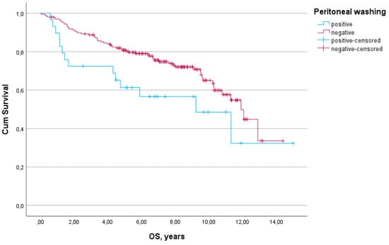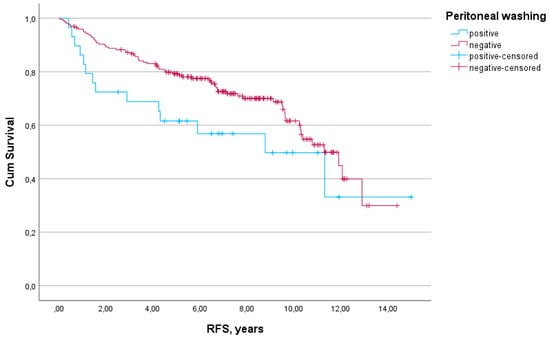 The median follow-up was 6.9 years. A total of 82 events occurred in the RFS analysis, and 76 events occurred in the OS analysis. The impact of positive peritoneal cytology on RFS and OS in the study population is presented in Figure 1 and Figure 2. A nonsignificant trend towards worse RFS was observed in patients with positive washings (HR 1.64; 95% CI 0.92–2.93; p = 0.091). OS was significantly worse in patients with positive peritoneal cytology (HR 1.82; 95% CI 1.02–3.26; p = 0.043).