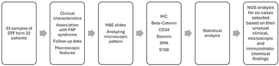 Schematic illustration of the study method. DTF, desmoid-type fibromatosis; FAP, familia adenomatous polyposis; H&E, hematoxylin and eosin; IHC, immunohistochemistry; NGS, next-generation sequencing.