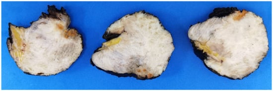 An ethical approval to conduct this study was obtained from the unit of biomedical ethics at King Abdulaziz University Hospital, Jeddah, Saudi Arabia, reference number 287-23, 23 May 2023. A total of 33 formalin-fixed paraffin-embedded (FFPE) tissue samples of desmoid-type fibromatosis (DTF) were retrieved from the histopathological archives of King Abdulaziz University Hospital spanning the period from 2010 to 2022. These samples were collected from 32 patients. The medical records of patients were reviewed to assess clinical characteristics, age, location, sex, follow-up data, and association with familial adenomatous polyposis (FAP) syndrome, along with the macroscopic features. All samples’ H&E and immunohistochemical slides were thoroughly analyzed and evaluated based on the specific criteria outlined below. The results were statistically analyzed using STATA software version 18, StataCorp LLC. 2023. Stata Statistical Software: Release 18, College Station, TX, USA. Six cases were molecularly tested using next-generation sequencing (NGS), and they were selected to be sequenced based on their unusual clinical and microscopic/immunohistochemical findings (Figure 1). The Macroscopic features of DTF usually show an infiltrative firm gritty lesion with a white, tan trabeculated cut surface, (Figure 2).