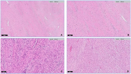 The soft tissue pathologist (R.M.A.) assessed all H&E-stained slides available for each case, which ranged from 1 to 20 slides. The morphologic diagnosis was then verified through a histological review. After conducting a thorough search of the histopathology literature [15,33], it has been observed that desmoid fibromatosis exhibits seven distinct histologic patterns. These include conventional, hypercellular, hyalinized/hypocellular, myxoid, keloid-like, nodular fasciitis-like, and hemangiopericytomatous-like patterns. Desmoid-type fibromatosis is characterized by the presence of fibroblast/myofibroblast cells that exhibit oval, pale-staining, or vesicular nuclei with one or two small, inconspicuous nucleoli. These cells do not display nuclear hyperchromasia or atypia, possess varying quantities of cytoplasm, and have ill-defined cell membranes. The microscopic descriptions that have been utilized to analyze each pattern in this study are as follows: (1) The conventional pattern is distinguished by uniform cellularity and the presence of long, sweeping fascicles that extend across the diameter of a low power field. These fascicles consist of thin fibroblasts/myofibroblasts that are evenly spaced and exhibit minimal or no cell-to-cell contact (Figure 3A,B). (2) The hypercellular pattern has a higher cellular density compared with the conventional pattern, accompanied by an increase in nuclear overlaps (Figure 3C,D). (3) The hyalinized/hypocellular pattern is characterized by a low number of cells and a reduced cellular density. Fibroblasts and myofibroblasts are sparsely distributed within a heavily hyalinized collagenous background (Figure 4A). (4) The myxoid pattern is distinguished by a profuse myxoid background, including loosely arranged hypocellular regions of spindle cells (Figure 4B,C). (5) The keloid-like pattern is characterized by the presence of collagenized bands that vary in size and exhibit a bright eosinophilic appearance (Figure 4D). (6) A nodular fasciitis-like pattern characterized by loose short and storiform fascicles of spindle to stellate cells with an edematous background and extravasated RBCs (Figure 5A). (7) The hemangiopericytomatous-like pattern, characterized by the presence of thin-walled, branched blood vessels, with a particular emphasis on the presence of staghorn-shaped vessels (Figure 5B). The occurrence and relative proportion of these patterns were documented for each case of desmoid-type fibromatosis in this set of specimens. Additional histologic parameters were examined, which encompassed the presence of lymphoid aggregation (Figure 5C), perivascular edema (Figure 5D), tumor boundaries, spindle cell atypia characterized by nuclear hyperchromasia, and an increased N/C ratio (Figure 6A,B), along with the quantification of mitotic figures. A univariate analysis was conducted to examine the correlation between the histologic pattern and recurrence of DTF.