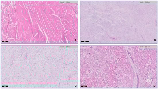 Continued histologic pattern of desmoid-type fibromatosis. (A) The hyalinized/hypocellular pattern is characterized by fibroblasts, and myofibroblasts are sparsely distributed within a heavily hyalinized collagenous background. (B,C) The myxoid pattern is distinguished by a profuse myxoid background including loosely arranged hypocellular regions of spindle cells, resembling cellular myxoma. (D) The keloid-like pattern characterized by the presence of collagenized bands that vary in size and exhibit a bright eosinophilic appearance.
