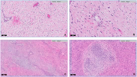 Perivascular edema was found in 31 (94%) of the tumors, while lymphoid follicles were found in 18 (54.5%) tumors. Cytological atypia was found in 27 (87%) samples, ranging from mild to moderate in 22 (67%) and 5 (15.15%) tumors, respectively. Mitosis was found in thirteen (39.3%) samples, ranging from one to four mitosises/ten high-power fields (HPFs), with a mean of two and a median of one. Two cases showed rare findings of chondromyxoid metaplasia (Figure 6C,D).