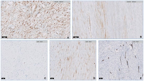 The percentage of cells with nuclear positivity for β-catenin ranged from 10 to 90% (mean 66.4%, median 80%) in all thirty-three (100%) DTF samples (Figure 7A). SMA positivity was found in 28 (85%) of the tumors, with percentages of positive cells ranging from 10 to 70% (mean 36.6%, median 32.5%) (Figure 7B). S100 was found in 17/33 tumors (51.5%), with the percentage of positive cells ranging from 1 to 5% (mean 2.4%, median 1%) (Figure 7C). Desmin was detected in 12/33 samples (36.36%), with the percentage of positive cells ranging from 10 to 30% (mean 14.16%, median 10%) (Figure 7D). CD34 was found in 3/33 tumors (9.1%), with the percent of positivity ranging from 10 to 30% (mean 17%, median 10%) (Figure 7E).