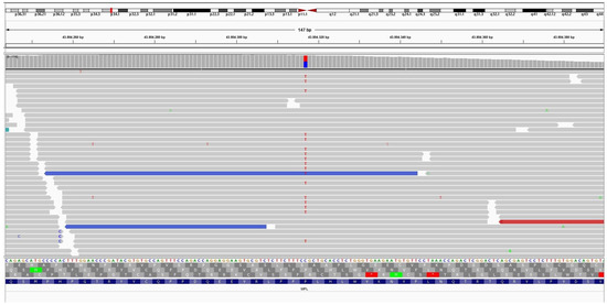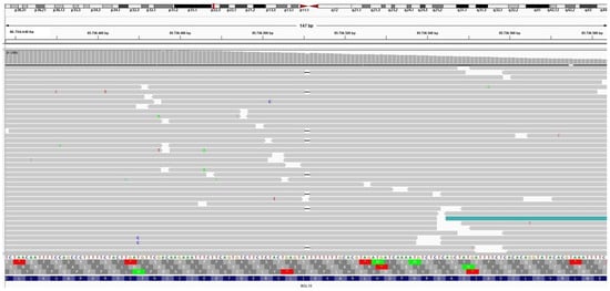 The NGS analysis identified a deleterious mutation in the CTNNB1 gene variation c.114_149del p.(Ala39_Gly50del) (Frequency 16.4% of 1846 NGS reads) in a 24-year-old female patient with abdominal wall desmoid-type fibromatosis. This mutation is an in-frame deletion of 36 base pairs in exon 3, resulting in the loss of 12 amino acid residues in the N-terminal region of the β-catenin gene. In addition, it was discovered that in the same case, a non-CTNNB1 mutation, including BCL10 mutation variant c.136del p.(Ile46Tyrfs 24) (Frequency: 5.9% of 1649 NGS reads) (Figure 8), causes a disruption in the reading frame, beginning at codon 46 along with MPL gene mutation variant c.317C>T p.(Pro106Leu) (Frequency: 48.4% of 1544 NGS reads) (Figure 9). A 46-year-old male patient with Crohn’s disease and a small 1 cm intrabdominal desmoid-type fibromatosis (DTF) was found to have a CTNNB1 mutation variant c.133T>C p.(Ser45Pro) (Frequency: 21.1% of the 3287 NGS reads) in the N-terminus of the protein. Additionally, the patient had an RBM10 gene mutation variant c.1049_1067inv p.(Gln350_Ser356delinsArgAlaLeu) (Frequency: 5.4% of the 1065 NGS reads). An example of extra-abdominal (right leg) DTF in a 37-year-old male patient with an abundance of myxoid, hyalinized, and hypocellular histologic pattern and limited conventional pattern NGS identified the CTNNB1 variant c.121A>G p.(Thr41Ala) (Frequency: 40% of 1889 NGS reads) situated in the protein’s N-terminus. The APC gene mutation variant c.4348C>T p.(Arg1450) (Frequency: 66% of the 1338 NGS reads) generates a premature stop codon in one of the two FAP cases of DTF that have been studied, one of which is a 10-year-old girl with a neck mass and recurrent abdominal wall mass. In another case of a 37-year-old female patient with FAP syndrome and intra-abdominal DTF, NGS revealed three APC genetic alterations, including: 1. c.3316G>T p.(Gly1106) (Frequency: 51% of 2059 NGS reads); 2. c.4604del p.(Asn1535Metfs 30) (Frequency: 14% of 1665 NGS reads); and 3. c.4645dup p.(Gln1549Profs 10) (Frequency: 8% of 1700 NGS reads). One case of breast DTF NGS failed to reveal CTNNB1 or APC gene mutation (CTNNB1 wild type).