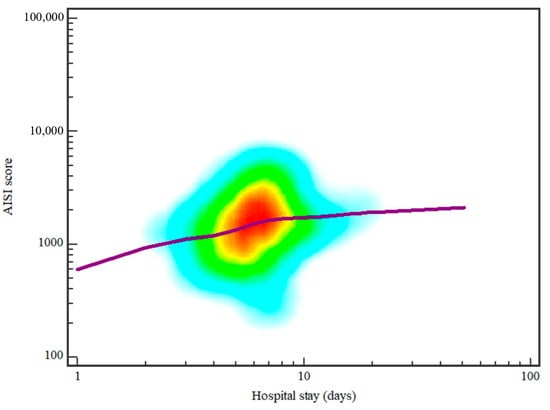Spearman correlation between hospital stay in days and AISI score ρ = 0.226, p = 0.0007). The image shows a graph depicting the relationship between hospital stay (in days) on the x-axis and the AISI score on the y-axis, both on logarithmic scales. A colored density plot highlights data concentration, with red indicating the highest density. The trend line suggests a gradual increase in AISI score as the hospital stay lengthens.