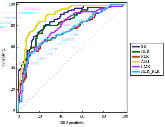 Furthermore, to determine the value of the analyzed scores as possible clinical predictors of the seriousness of abscess, an ROC analysis was performed. The AISI score was shown to be a very strong indicator of abscess seriousness (SE = 82.93, SP = 81.63, AUC = 0.90, Y = 0.65, p = 0.0001), while the other analyzed scores were moderate to strong indicators, namely the SII score (SE = 81.30, SP = 74.49, AUC = 0.86, Y = 0.56, p = 0.0001), the NLR score (SE = 79.67, SP = 76.53, AUC = 0.83, Y = 0.56, p = 0.0001), the LMR score (SE = 59.35, SP = 84.69, AUC = 0.80, Y = 0.44, p = 0.0001), the PLR score (SE = 54.47, SP = 88.78, AUC = 0.75, Y = 0.43, p = 0.0001) and the NLR_PLR score (SE = 53.66, SP = 90.82, AUC = 0.75, Y = 0.44, p = 0.0001) (Figure 2).