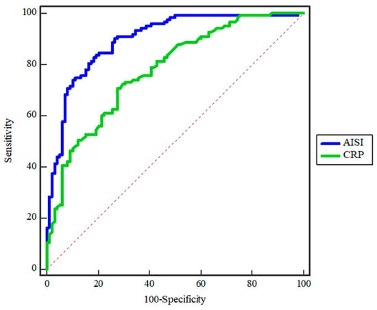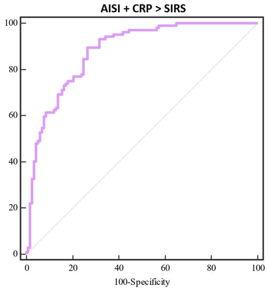 Additionally, the AISI score (SE = 85.58, SP = 77.78, AUC = 0.88, Y = 0.64, p < 0.0001) and CRP level (SE = 73.08, SP = 67.52, AUC = 0.74, Y = 0.41, p < 0.0001) were analyzed to SIRS, both having significant value; still, the AISI score showed to have stronger prognostic value. Together, the AISI and CRP values showed to be significant prognostic factors (SE = 89.42, SP = 73.50, AUC = 0.88, Y = 0.63, p < 0.0001) (Figure 3).
