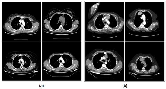 Sample images from the dataset categories: (a) patients without thymoma, and (b) patients with thymoma.