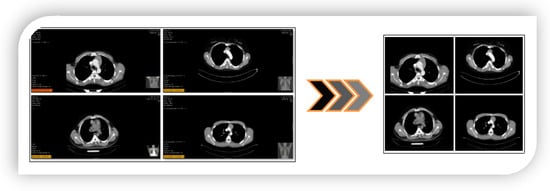 The first step is to refine the dataset to make it more useful before training the transform models. For each image, the Python code ’ResizedCrop(224)’ was used to reconstruct the resolution from the center of the image to 224 × 224. Then, the ROI technique, supported by the Pandas and Numpy libraries and designed in Python, was applied to the images to foreground the desired regions. An example image subset of this step is shown in Figure 2 and Figure 3.