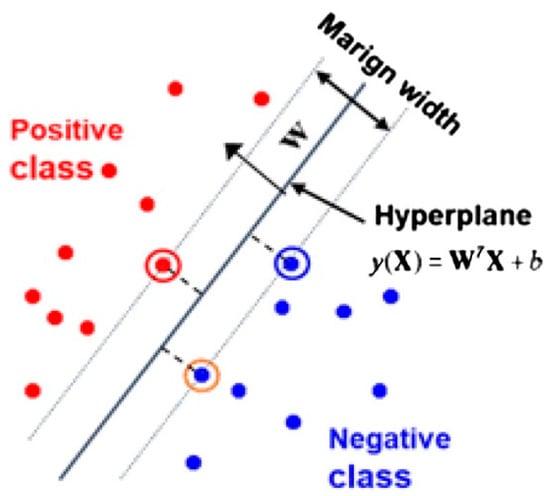 The objective of Equation (1) is to reduce the issues that arise during the classification process. In Equation (3), and denote the features. is half the width of the margin, while is a bias term that determines the location of the decision boundary. This equation provides an estimate to identify the class of the input data [12,13,14].