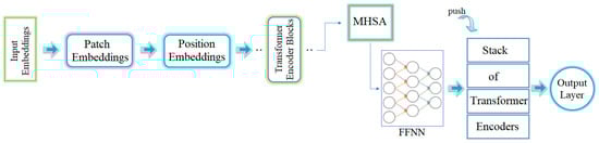 - The fourth stage contains the transformer encoder blocks. The ViT architecture includes several transformer encoder blocks, each of which consists of two main components. The first component is Multi-head Self-Attention (MHSA), which is responsible for querying and modeling correlations between image patches. The second component is a feed-forward neural network (FFNN), which extracts and processes features from each patch and then applies the necessary transformations for the next stage.