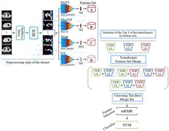 Background: Thymoma is a tumor that originates in the thymus gland, a part of the human body located behind the breastbone. It is a malignant disease that is rare in children but more common in adults and usually does not spread outside the thymus. The exact cause of thymic disease is not known, but it is thought to be more common in people infected with the EBV virus at an early age. Various surgical methods are used in clinical settings to treat thymoma. Expert opinion is very important in the diagnosis of the disease. Recently, next-generation technologies have become increasingly important in disease detection. Today’s early detection systems already use transformer models that are open to technological advances. Methods: What makes this study different is the use of transformer models instead of traditional deep learning models. The data used in this study were obtained from patients undergoing treatment at Fırat University, Department of Thoracic Surgery. The dataset consisted of two types of classes: thymoma disease images and non-thymoma disease images. The proposed approach consists of preprocessing, model training, feature extraction, feature set fusion between models, efficient feature selection, and classification. In the preprocessing step, unnecessary regions of the images were cropped, and the region of interest (ROI) technique was applied. Four types of transformer models (Deit3, Maxvit, Swin, and ViT) were used for model training. As a result of the training of the models, the feature sets obtained from the best three models were merged between the models (Deit3 and Swin, Deit3 and ViT, Deit3 and ViT, Swin and ViT, and Deit3 and Swin and ViT). The combined feature set of the model (Deit3 and ViT) that gave the best performance with fewer features was analyzed using the mRMR feature selection method. The SVM method was used in the classification process. Results: With the mRMR feature selection method, 100% overall accuracy was achieved with feature sets containing fewer features. The cross-validation technique was used to verify the overall accuracy of the proposed approach and 99.22% overall accuracy was achieved in the analysis with this technique. Conclusions: These findings emphasize the added value of the proposed approach in the detection of thymoma.