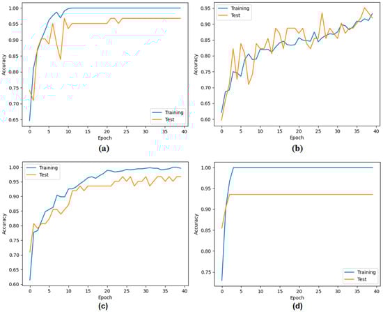 Confusion matrices obtained by combining the feature sets between the models (training/test rate: 0.8/0.2—classifier: SVM): (a) DeiT3 and Swin (W), (b) DeiT3 and ViT (V), (c) Swin and ViT (Y), and (d) DeiT3 and Swin and ViT (Z).