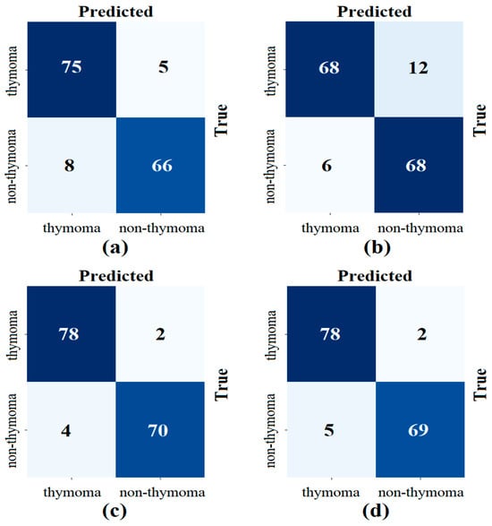 Confusion matrices obtained by combining the feature sets between the models (cross validation: k = 10 and classifier: SVM): (a) DeiT3 and Swin (W), (b) DeiT3 and ViT (V), (c) Swin and ViT (Y), and (d) DeiT3 and Swin and ViT (Z).