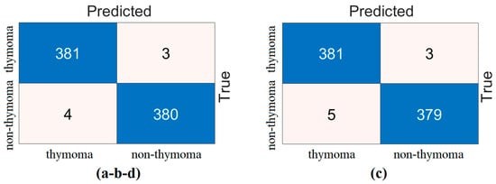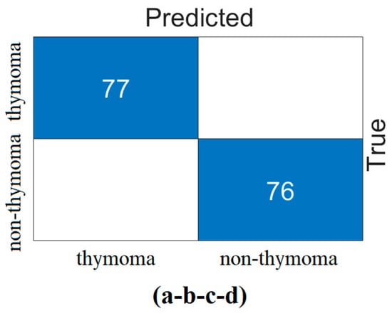 The SVM method was then used to measure the performance of the four combined feature sets. In the analyses performed in this step, the test data were set to 20% and a cross-validation technique was used to confirm the validity of the performance (k = 10 was chosen). The confusion matrices obtained from the test data as a result of the analysis are shown in Figure 9. The confusion matrices obtained with the cross-validation technique are shown in Figure 10. The metric results of the confusion matrices in Figure 9 and Figure 10 are given in Table 7. The inter-model feature fusion approach and classification with SVM showed 100% overall success performance as a result of the analyses performed by separating the dataset into training and test.