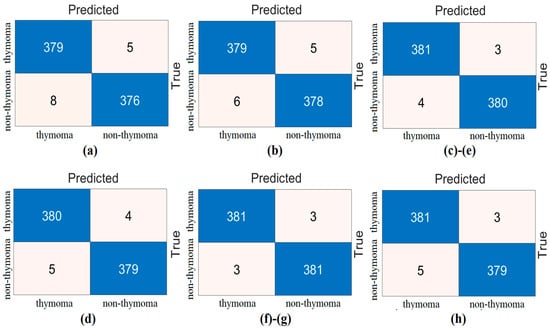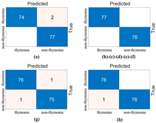 Confusion matrices obtained by SVM classification of the best features selected by mRMR feature selection method (train rate: 0.8, test rate: 0.2): (a) the top 50 features, (b) the top 100 features, (c) the top 200 features, (d) the top 300 features, (e) the top 400 features, (f) the top 500 features, (g) the top 750 features, and (h) the top 1000 features.