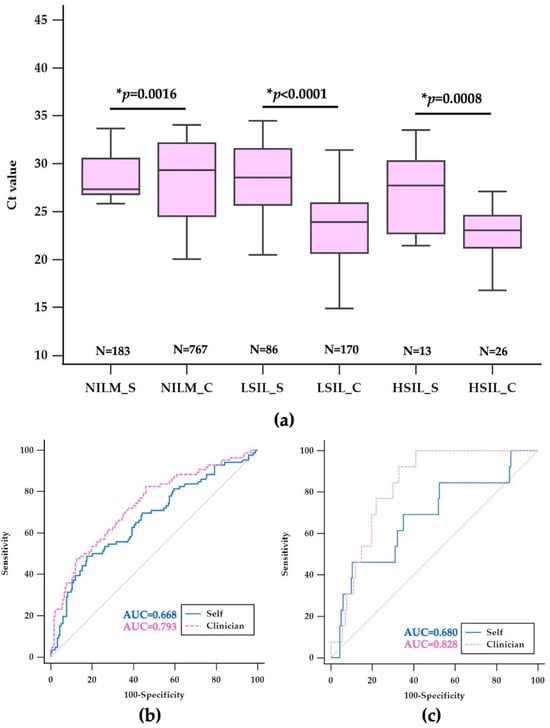 Boxplot comparison of Ct values by cytology grading results (a) and ROC curves for Ct value distribution and diagnostic accuracy in the detection of LSIL (b) and HSIL (c) in self-collected versus clinician-collected samples. Note: An asterisk (*) indicates statistically significant differences in Ct values (p < 0.0001). The grey dotted line represents the line of no discrimination, indicating performance equivalent to chance.