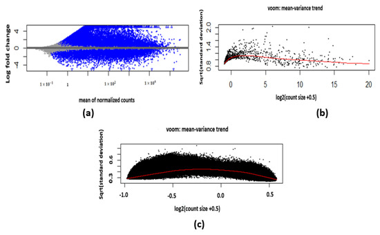 The GDCquery function [22] is used to create a query for obtaining multi-omics data, which include gene expression quantification, miRNA expression quantification, and DNA methylation data from the GDC portal. This query specifies the data from two TCGA projects using the identifiers TCGA-LUAD (lung adenocarcinoma) and TCGA-LUSC (lung squamous cell carcinoma). This should include both primary tumor samples and solid tissue normal samples so that we can compare the methylation patterns between the two types of tissues and obtain an understanding of the epigenetic changes which accompany lung cancer. The obtained data were preprocessed using the GDCprepare function, which is part of the TCGAbiolinks R package designed for handling TCGA data. Also, the function includes an option which helps in the handling of the downloaded data files from the GDC portal to change the data from a raw form to a format amenable to analysis in R by carrying out preprocesses of the data, such as normalization, filtering, and annotation of the data, to check for consistency of the data received from the GDC portal. In addition, it includes molecular profile data (for example, gene expression, miRNA expression, DNA methylation); thus, comprehensive integrative analyses can be conducted. We used the DESeq2 function version 1.40.2 [23] to analyze gene expression differences by fitting a generalized linear model to compare tumor and normal tissues. The result is presented in the form of count values, and we selected the data so as to remove genes that have low intensity or low variation using the rowSums function. The genes are retained only when the total counts in all the samples exceed the counts of 2 and when there are not less than 4 samples with more than the count of 2. The miRNA expression and DNA methylation data were processed using the limma package version 3.56.2 [24] in R, which aims at the linear modeling of microarray and RNASeq or mRNA data. The package fits a linear model to each miRNA in the expression or to the DNA methylation data to model the association between the expression levels and the experimental conditions (tumor versus normal tissues). With this approach, it is possible to obtain a list of genes or features which have significant differences between the tumor and normal samples; therefore, the non-significant features are filtered out. The visualization of the mRNA data after the differential expression analysis is depicted in Figure 2a. The plot indicates the correlation between the mean of the counts, after data normalization (x-axis), with the log fold change (y-axis). The diagnostic plots from the voom function of the limma package for miRNA and DNA methylation are presented in Figure 2b,c. These plots reflect the mean variance plot of the data after the voom transformation for miRNA or DNA methylation data; the voom transformation helps to reduce the variability of the data.