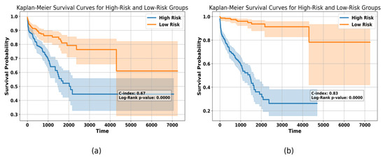 Figure 3 depicts the results of applying Kaplan–Meier survival curves to our data before and after features selection. We calculated the low- and high-risk groups based on a risk score derived from the features, using the median risk score as a threshold to differentiate between these groups. To calculate the risk score, we first applied principal components analysis (PCA) to the features (mRNA, miRNA, and DNA methylation) to reduce the dimensionality. Then, we dropped the highly correlated features and used chi-square in order to determine the features that were most useful in predicting the patients’ survival. We used Cox proportional hazards together with L2 regularization to obtain the risk score. The survival curves comparison between the high-risk and low-risk patients before applying the chi-square test as a features selection process showed a C-index of 0.67. Nevertheless, after performing the chi-square feature selection, the Kaplan–Meier analysis was improved and obtained a C-index of 0.83. This improvement demonstrates that the selected features are more informative and can better distinguish between the survival outcomes. As these features are more biologically relevant, the Kaplan–Meier curves imply a better and appropriate stratification of the patients, enabling the creation of a better and easily interpretable deep learning model for predicting survival. It increases not only the model’s predictive ability but also the possibility of clinical application by identifying features most relevant to patient outcomes.