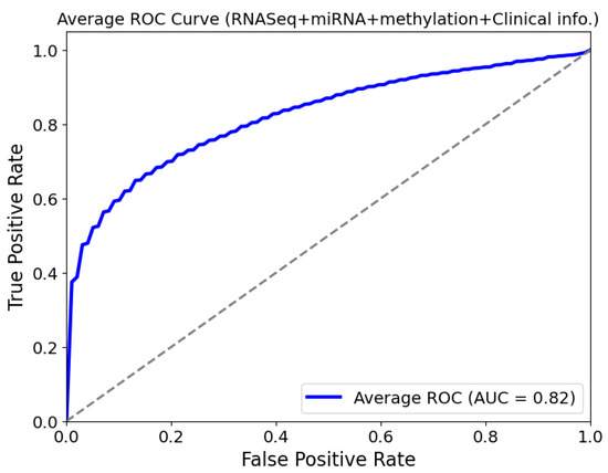 Average ROC curve for cancer survival prediction using mRNA, miRNA, methylation, and clinical information (AUC = 0.82).