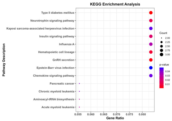 The features that had high attention weights in the GAT model were selected for further analysis. These features will have the highest biological relevance to the survival status of the patients and therefore indicate high confidence during the pathway analysis. The number of features that was used in the KEGG pathway analysis was 7425. During the process of pathway analysis, only 109 of these features could be converted to gene names using the clusterProfiler package version 4.12.2 in R. With the most recent gene annotation, the clusterProfiler package covers the functional properties of genomics data, both coding and non-coding, for thousands of species [35]. The KEGG analysis showed that the 109 genes were involved significantly in 13 enriched pathways with a p-value of less than 0.05. These 13 pathways included Type II diabetes mellitus, the neurotrophin signaling pathway, Kaposi sarcoma-associated herpesvirus infection, and pancreatic cancer, among others, as depicted in Figure 6. Although there is no direct lung cancer-specific pathway among the listed pathways, some of these pathways such as the chemokine signaling pathway and neurotrophin signaling pathway can be relevant to lung cancer. These pathways are involved in immune response, inflammation, and signal transduction, which are deemed to motivate cancer development, including lung cancer. The ratio on the x-axis in Figure 6 represents the percentage ratio of our selected genes to the genes in each pathway; the size of the dots in the figure represents the number of the genes that contribute to the pathway. The bar itself consists of several shades of gray, each corresponding to the path’s significance level; the darker the shade, the higher the p-value. These subsets provide essential information with which to understand the biological hallmarks in lung cancer pathophysiology. This identification of these pathways means that these genes can be crucial in the development stages of lung cancer and might be good subjects for therapeutic intervention. It also demonstrates how the GAT should be employed to identify biomarkers which, with an attention weight of 1, provide more robust and effective pathway analysis. Furthermore, there are other works that have connected some of the pathways that are presented in Figure 6 to lung cancer. For instance, pathways such as Type II diabetes mellitus [36,37], Influenza A [38,39], and Epstein–Barr virus infection [40,41] are found to be associated with lung cancer risk, and this supports our findings.
